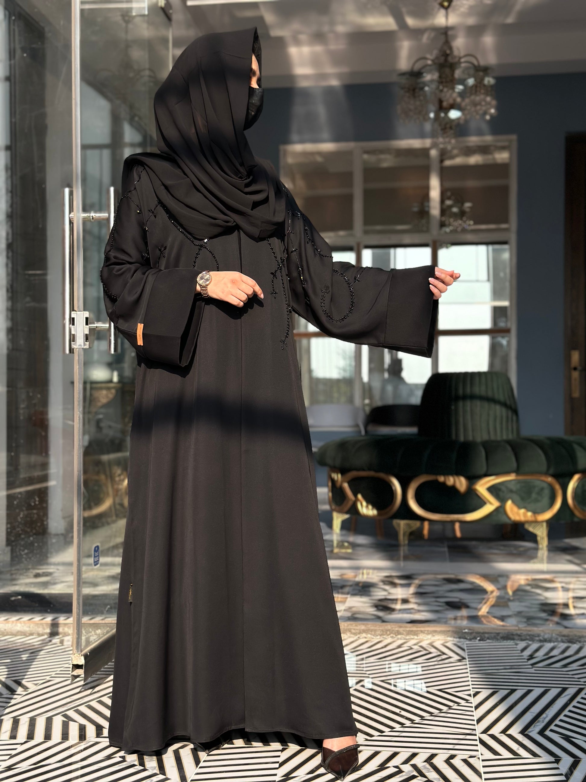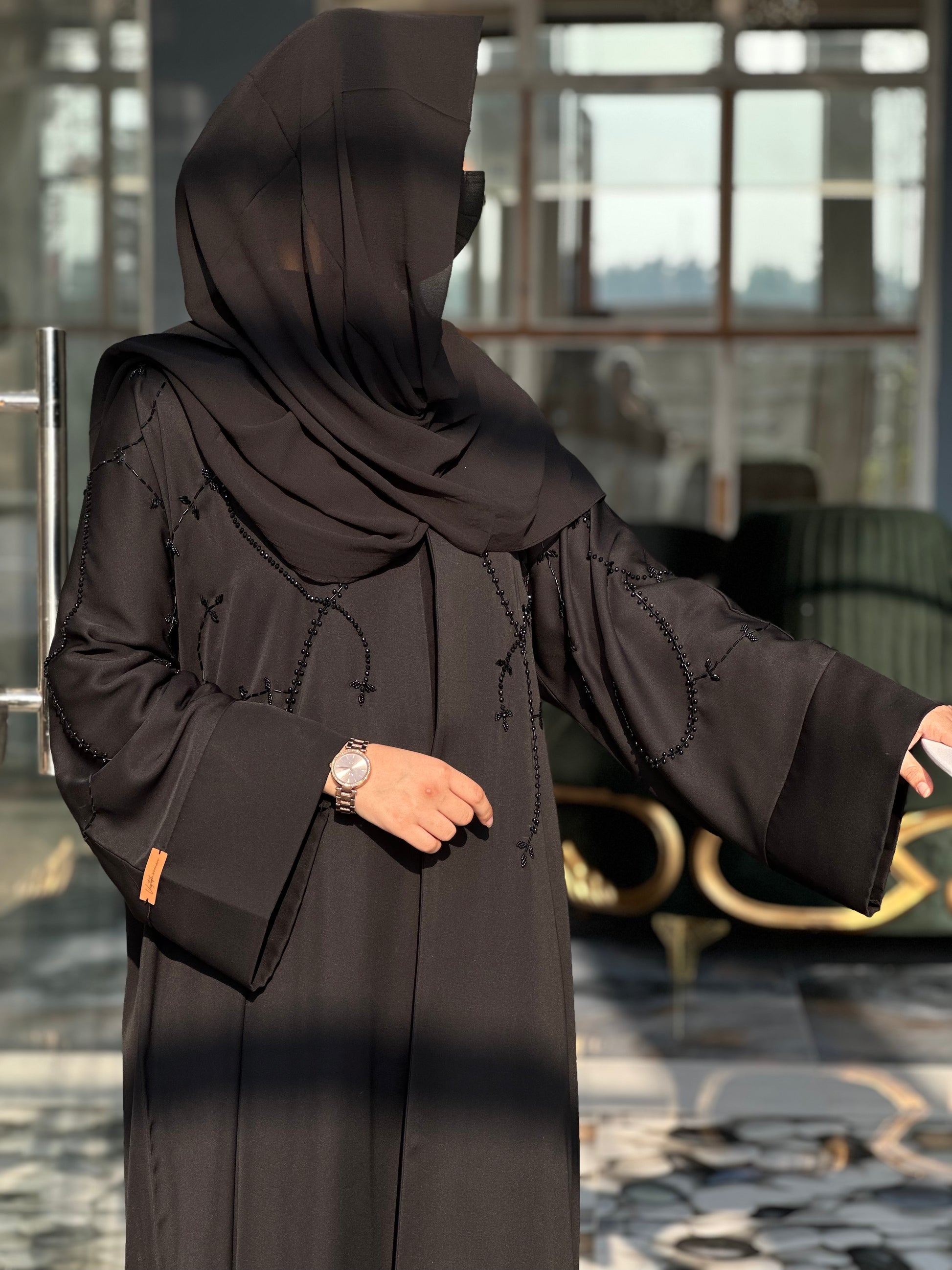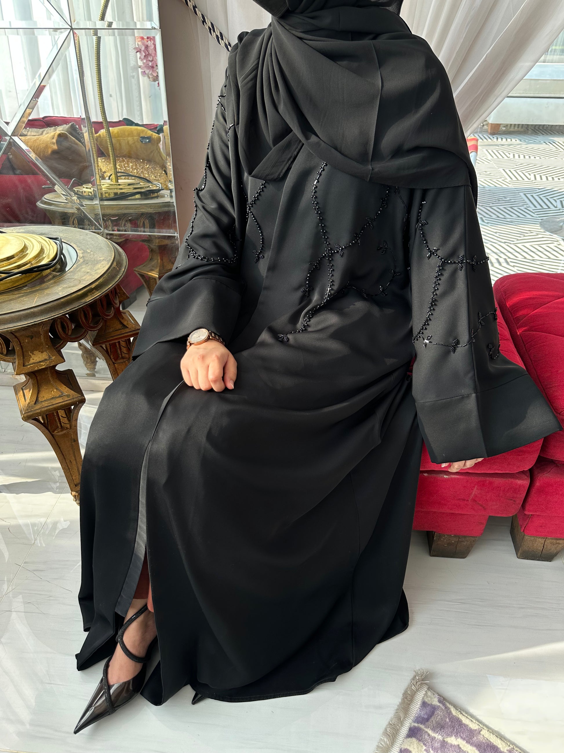 Product Features: Hand embellished Front open Abaya with invisible stitch and Titch Button.