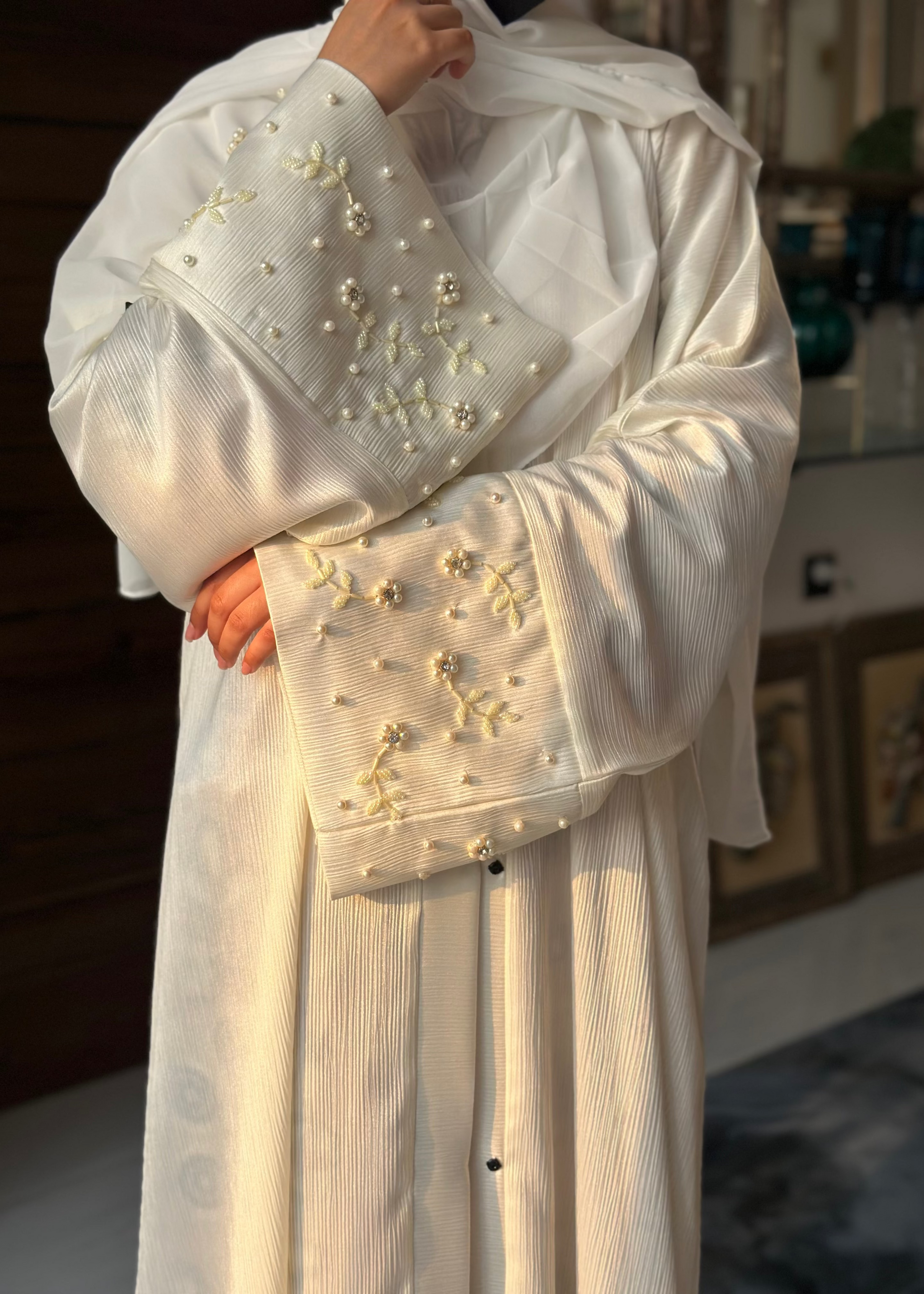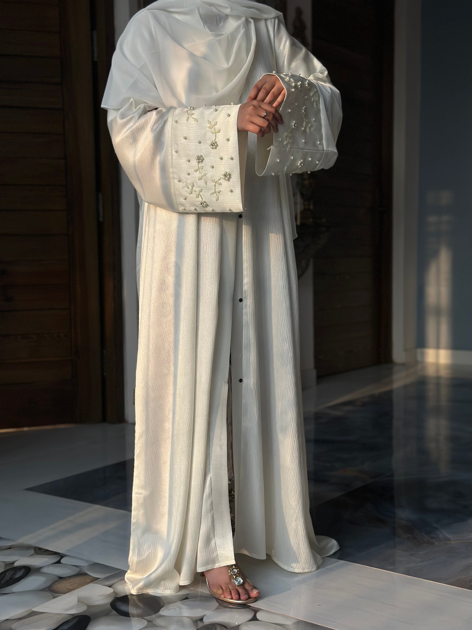 Product Features: Hand Embellished front open Abaya with Titch Button..